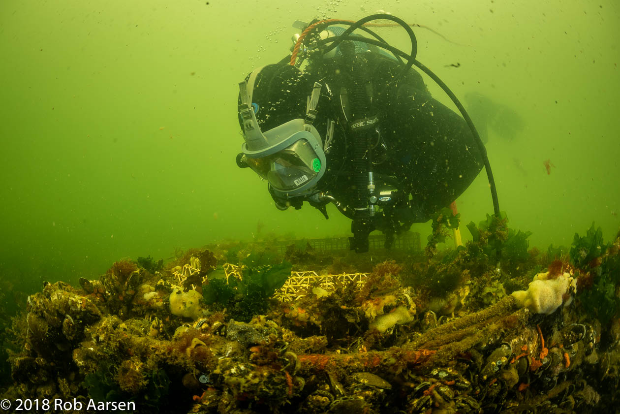 Op woensdag 22 augustus kregen we een uitgelezen kans om met eigen ogen te kijken bij de natuurlijke schelpdierbank naast de Brouwersdam en bij onze proefopstellingen daar. Erg leuk, want dit was de eerste keer voor mij en ik werk al 3 jaar aan het project. Het zicht was zoals te verwachten op deze locatie, zo’n 1,5 m.