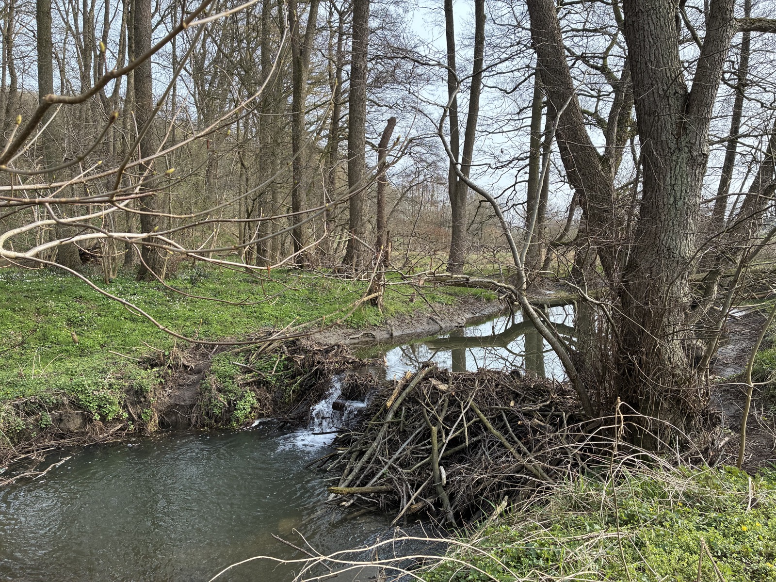 De dam bij Slenaken is een treffend voorbeeld van hoe bevers hun leefgebied inrichten naar hun eigen behoeftes en wat dat betekent voor de omgeving. Je hoort er het zachte geklots van water dat langs en door de dam sijpelt, terwijl daarachter een verhoogd wateroppervlak ligt waarin boomtoppen worden weerspiegeld.
