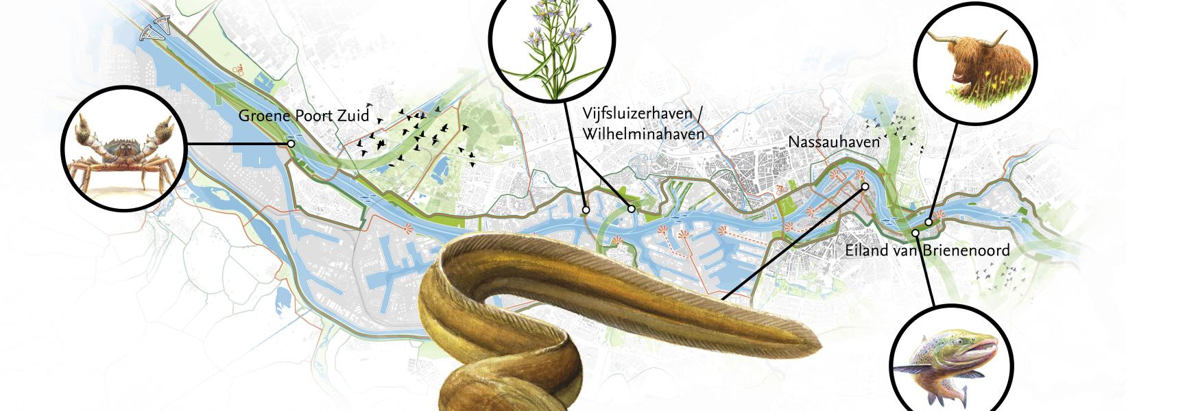De Nassauhaven in hartje Rotterdam is een havenbekken dat niet meer in gebruik is. In 2018 komen hier drijvende woningen (havenlofts) en wordt in twee fases een natuurvriendelijke oever aangelegd. Het water in de Nassauhaven wordt regelmatig gemonitord. Hierbij zijn zowel jonge én oude palingen gevonden. Dat betekent dat ze zich thuis voelen in Nassauhaven. Straks wordt dat nog beter, als de stenige oever is omgevormd tot een groene oase van oever- en waterplanten, waar glasaal en paling voedsel en beschutting vinden. De Nassauhaven biedt ze nu en straks een veilige en prettige thuishaven.