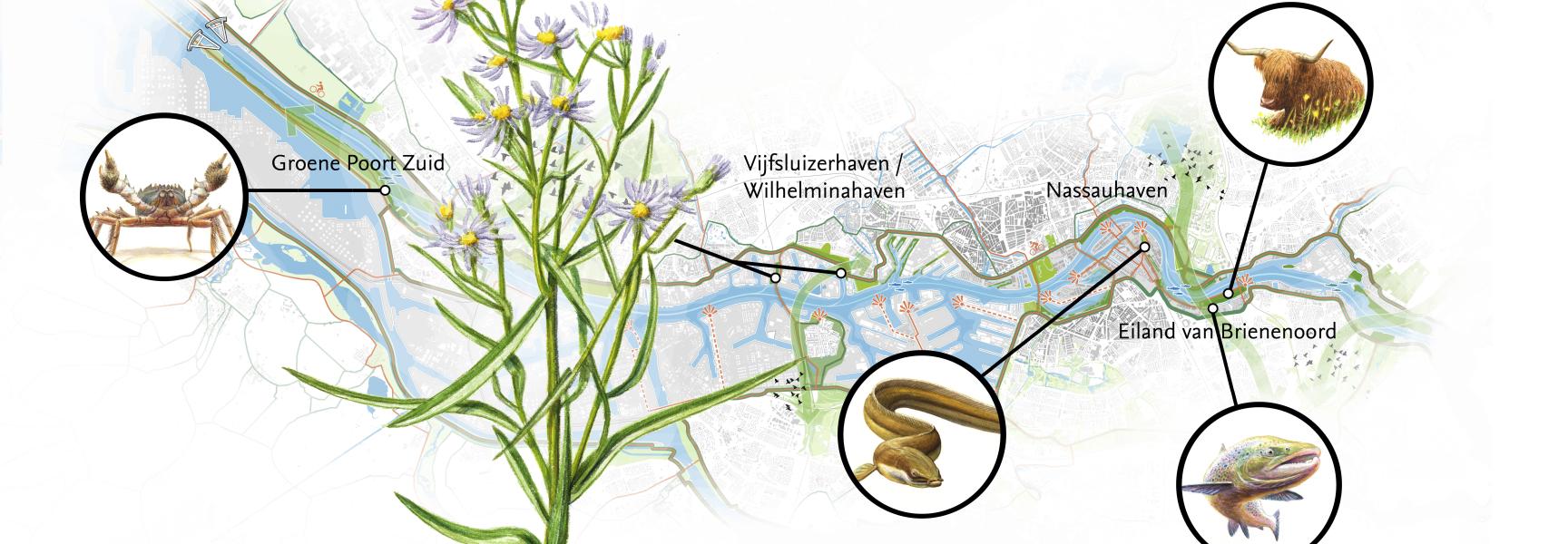 De Vijfsluizerhaven is in 2015 uitgediept en in verbinding gebracht met de Nieuwe Maas. Het resultaat is een fantastisch waddengebiedje. Planten zoals de zeeaster gedijen hier goed. Dit beeld zal zich straks in de Wilhelminahaven ook kunnen ontwikkelen, als hier een natuurvriendelijke oever is aangelegd waar eb en vloed vrij spel hebben.