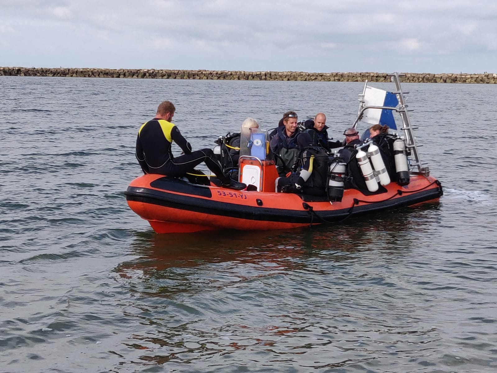 Hoewel Wouter Lengkeek (Bureau Waardenburg) ons lekker had gemaakt met verhalen over 5 meter zicht op dinsdag. Dat was tijdens de voorbereidingen van de duik door Bureau Waardenburg; we waren vandaag namelijk mee op hun uitnodiging, op de 1e dag van BuWa waarop ze opdrachtgevers mee nemen onder water. We mochten mee onder de voorwaarde dat je voldoende duikervaring hebt en een medische keuring. We kregen de tijdelijke status van ‘stagiair’, om zo te voldoen aan de regelgeving rond professioneel duiken in Nederland.