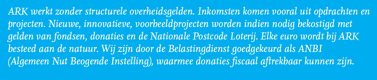 ARK Natuurontwikkeling bestaat 30 jaar. In dit jubileumjaar willen we de natuur nog een extra zetje in de rug geven. Daarom vragen we onze donateurs, fans, supporters en vrienden om een financiële bijdrage waarmee we de otter een mooi cadeau geven. Voor 37.926 euro kunnen we de ontbrekende schakel in het leefgebied van otters in natuurgebied de Gelderse Poort veiligstellen. Elke bijdrage is van harte welkom. Daarmee help je niet alleen de otter, maar geef je ook veel andere dieren een warm onthaal.