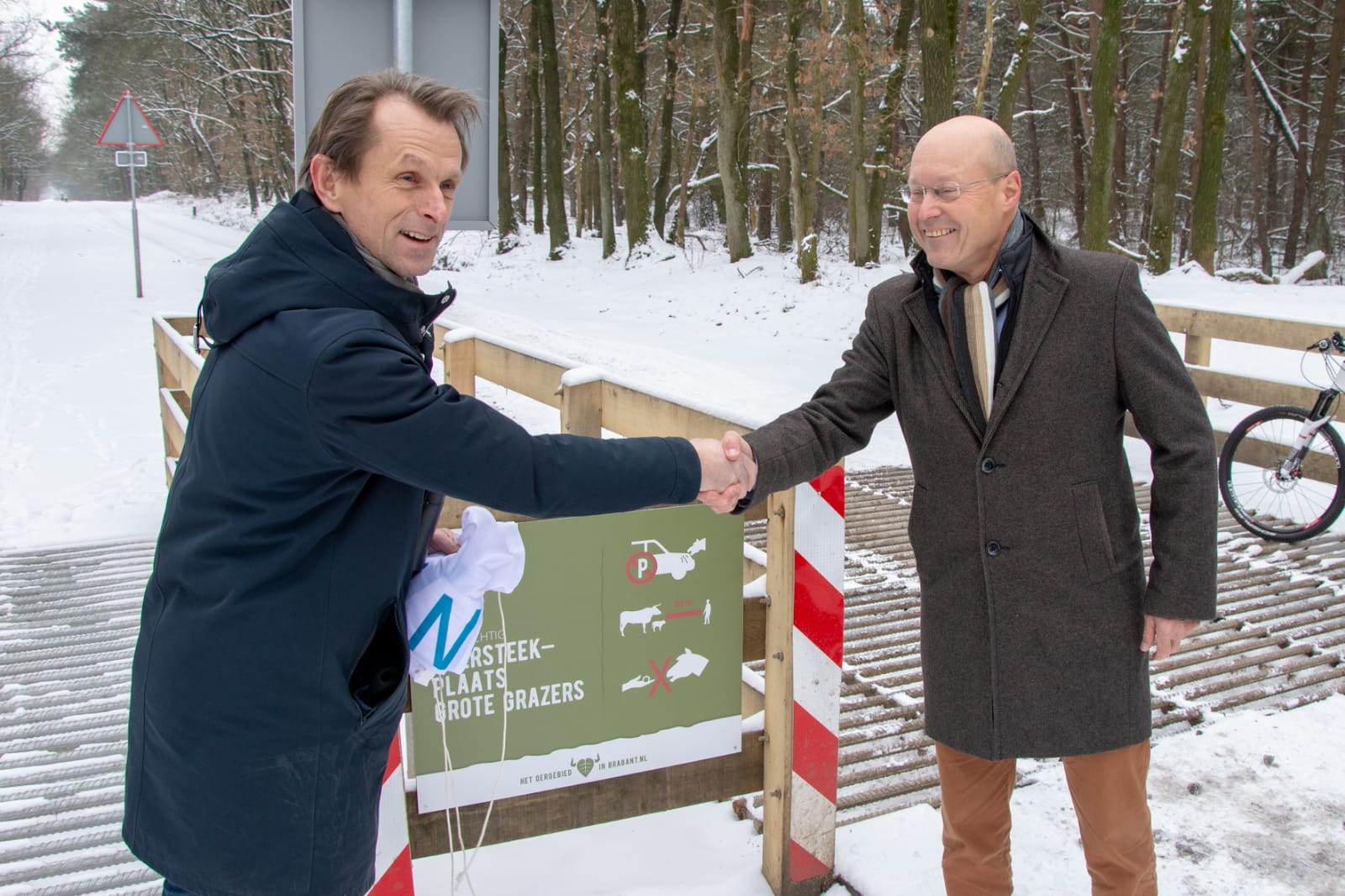 Het onthulde bord geeft aan dat weggebruikers op een oversteekplaats voor grote grazers komen. Hans Vereijken zei heel tevreden te zijn dat door deze schakel de ambitie om één groot begrazingsgebied in de kern van de Maashorst te maken, gerealiseerd is. Eind van het jaar wordt ook Herperduin erbij betrokken, want dan mogen de grote grazers over de natuurbruggen heen. Bij de ingang van de oversteekplaats benadrukte Hans Vereijken dat goede toegankelijkheid van het begrazingsgebied van groot belang is. “Momenteel wordt een proef gedaan met een hydraulische poort die gemakkelijk te openen is, met name voor rolstoel- en scootmobielgebruikers”, aldus de wethouder.