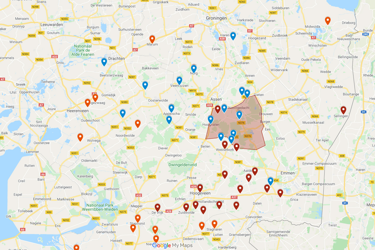 Door wolf veroorzaakte faunaschade in en om de provincie Drenthe. In rood de wolvenschade in Drenthe, in oranje die in andere provincies. In blauw de schade veroorzaakt door GW1261m, de wolf die maandenlang in Drenthe aanwezig was, maar inmiddels net over de grens in Duitsland zit. Bron: Andrea van den Eng.