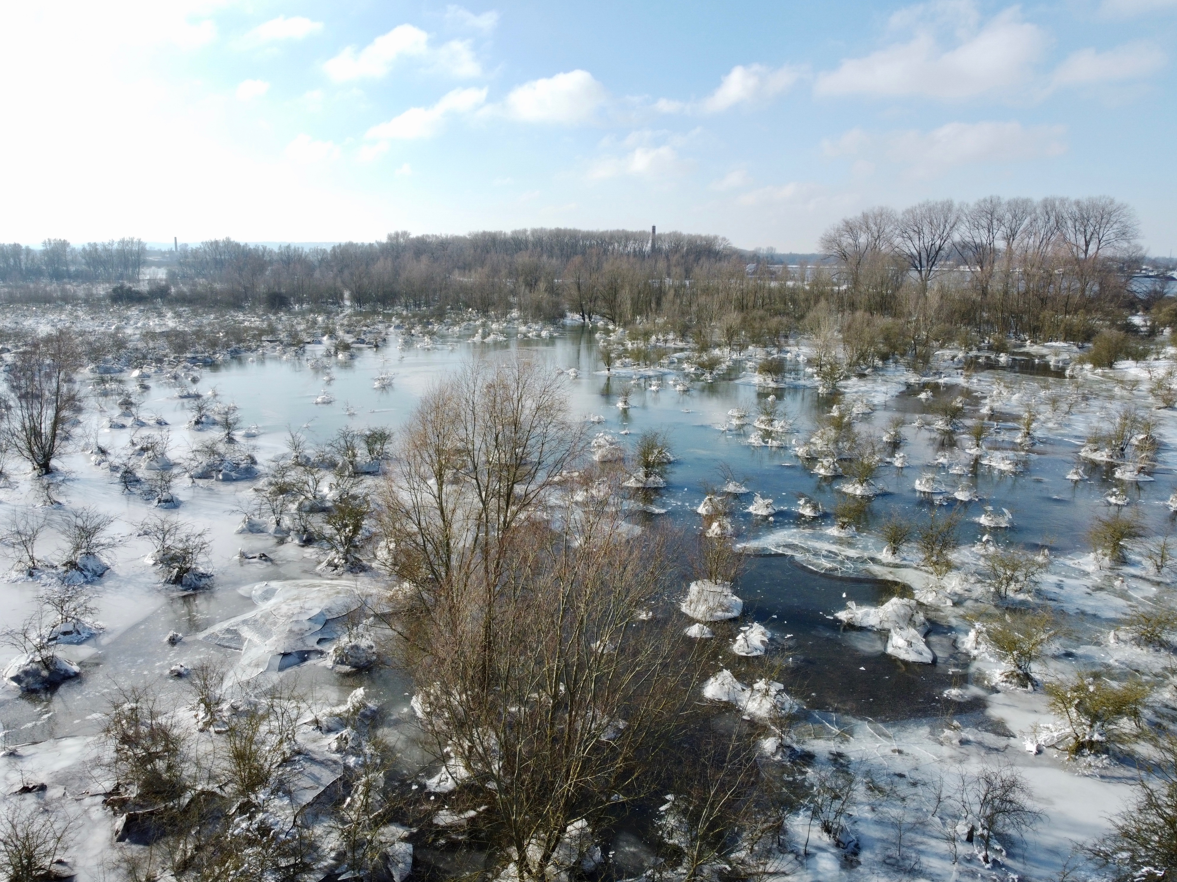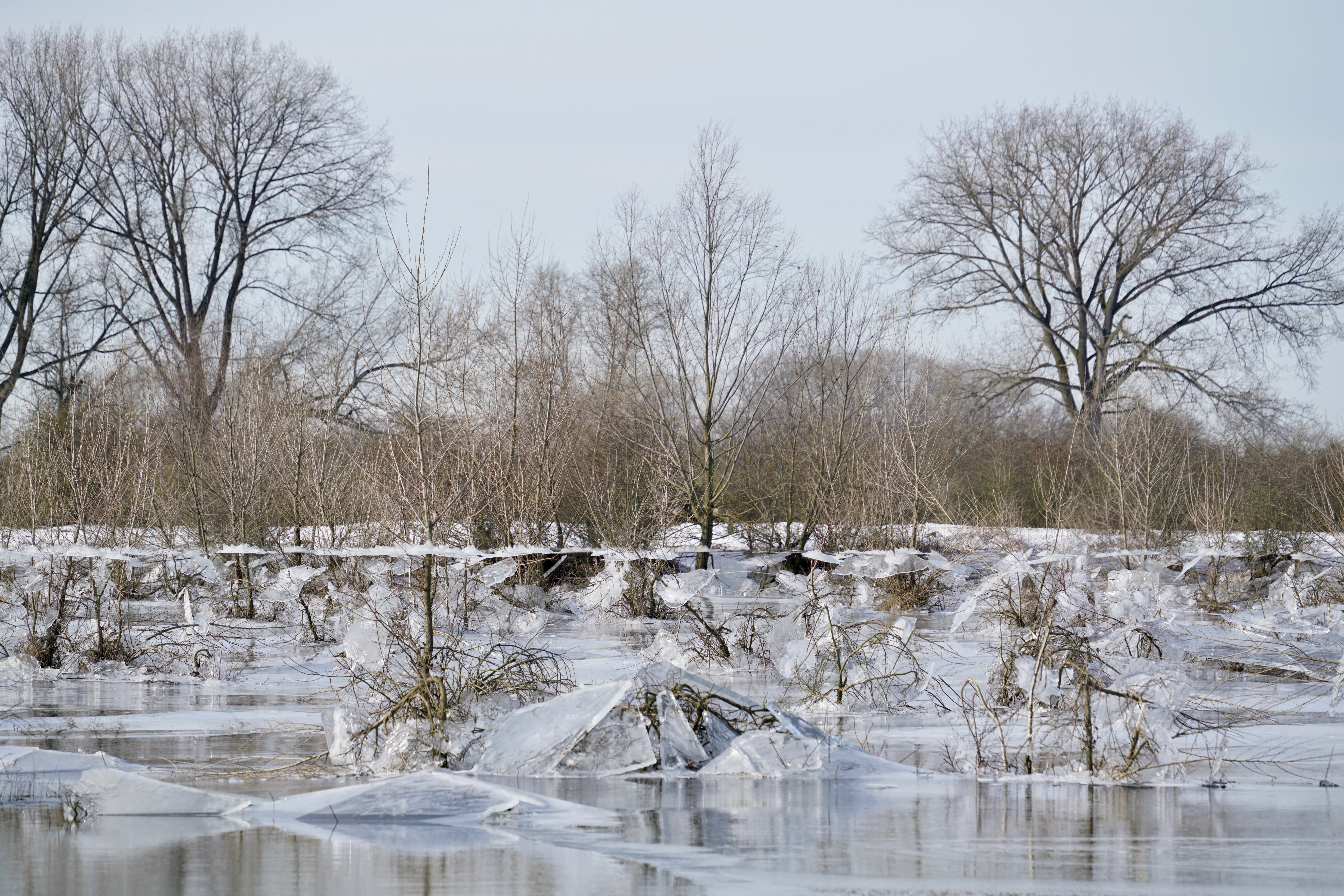 Precies op de piek van het hoogwater in de rivieren kregen we te maken met een week lang matige tot strenge vorst. Met name op plekken waar het water zwak stroomde vormde zich ijs. Een tweede gevolg van de vorstperiode was dat de toevoer van water vanuit Duitsland en Frankrijk meteen stagneerde. Daarop daalde de waterstand scherp, waardoor de ijsvloer, gehecht aan de takken van overstroomde struiken en bomen, ter plekke losbrak en vrij kwam te hangen. Als gevolg daarvan scheurden polsdikke zijtakken af. Op andere plekken daalde het ijs op een struik neer en drukte hem volledig plat. In terreinen met veel struiken is de ravage momenteel enorm. De ontwikkeling naar een volwassen bos is hierdoor weer bijna terug bij af. Voor de natuur heeft dit zeker gevolgen. Soorten van open landschap zullen er van profiteren. Maar de grauwe klauwieren die hier de afgelopen jaren broedden zullen bij terugkomst uit Afrika raar opkijken dat hun struwelen geen 3 meter, maar 50 centimeter hoog zijn. Wat het verder precies voor gevolgen heeft voor de natuur zal in de loop van het zomerseizoen blijken.